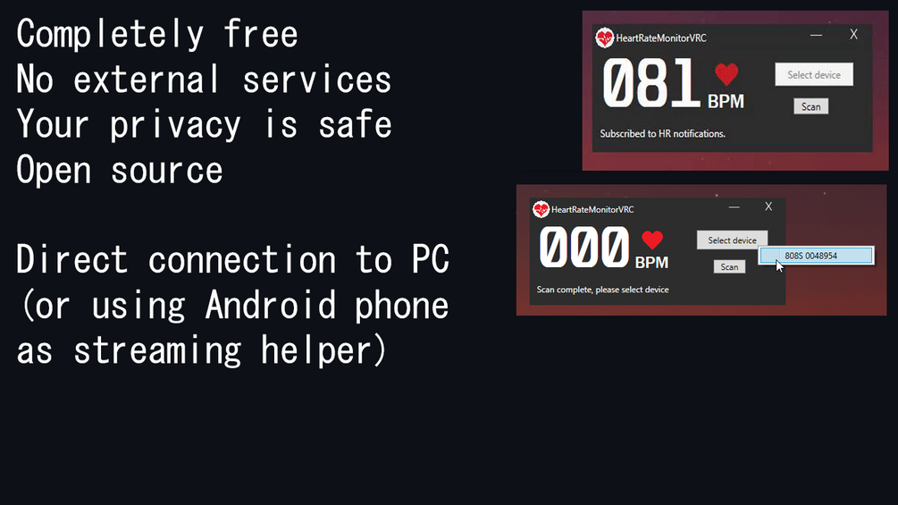 A free, open‑source desktop application (built in C#) that streams your heart‑rate data from a Bluetooth Low‑Energy (BLE) pulse‑oximeter directly into VRChat via OSC—no phone or web apps required